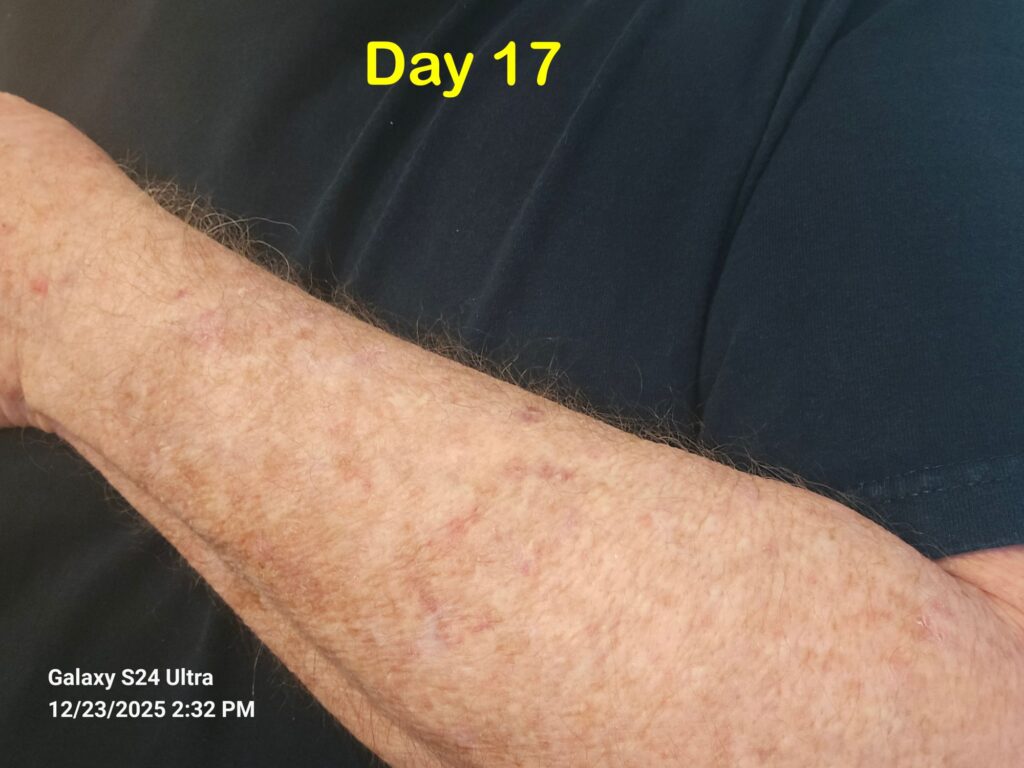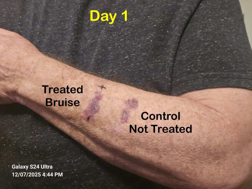 In this experiment, the treated bruise was barely visible after 10 days, while the untreated control bruise remained visible for 20 days. Bruise appearance, response and resolution will vary depending on the severity of the injury and the overall health of the individual.
