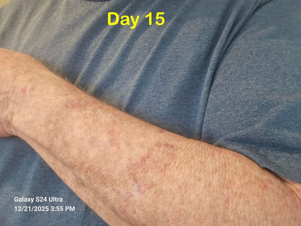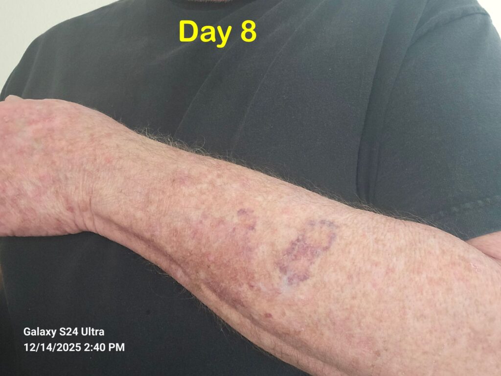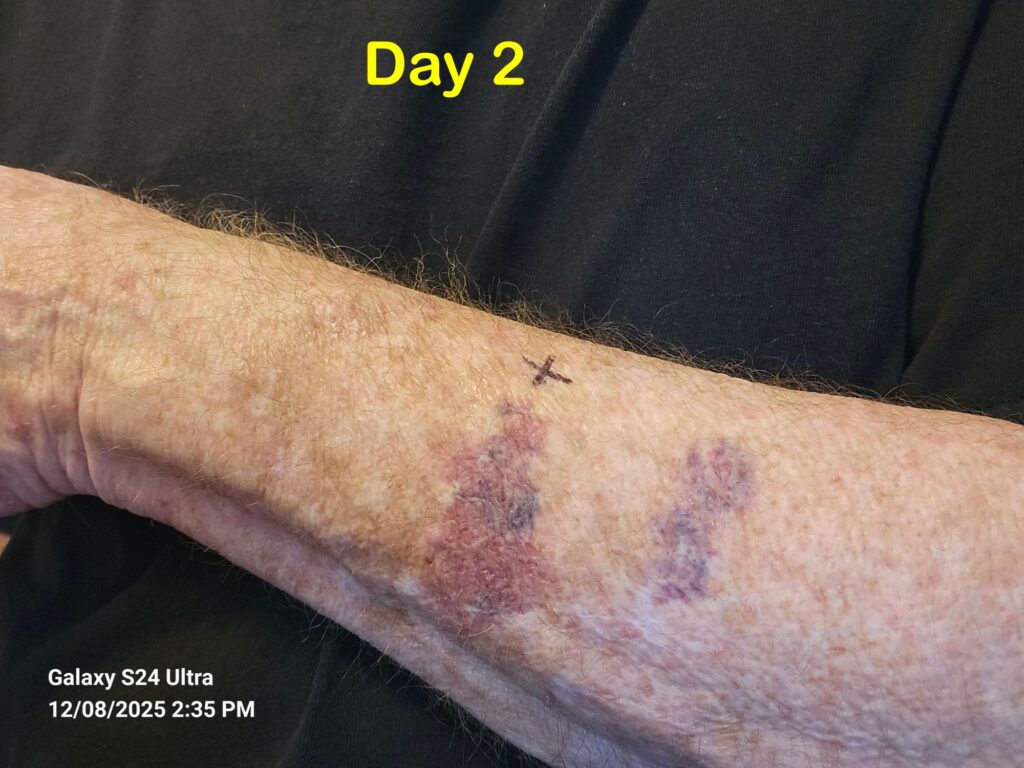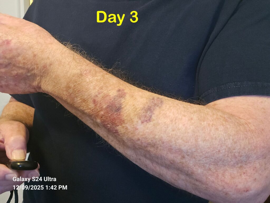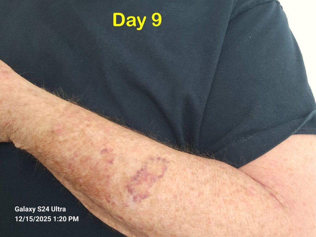 These photos are from the original product test. Two bruises were intentionally created by the volunteer for this experiment. One bruise was left untreated as a control, while the other was treated with Montana Flower Bruise Cream. The pictures were taken using a dark background to enhance visibility, the camera date stamp was enabled and the pictures were taken with similar lighting each time.